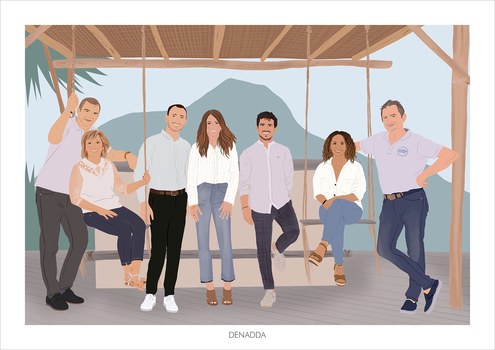 Découvrez la magie du trait : à partir de vos photos d’équipe, Elma réalise une illustration fidèle et harmonieuse, tout en apportant la touche artistique Denadda. Chaque détail est travaillé avec soin : expressions, postures, lumière ambiante — tout est pensé pour raconter votre histoire collective.